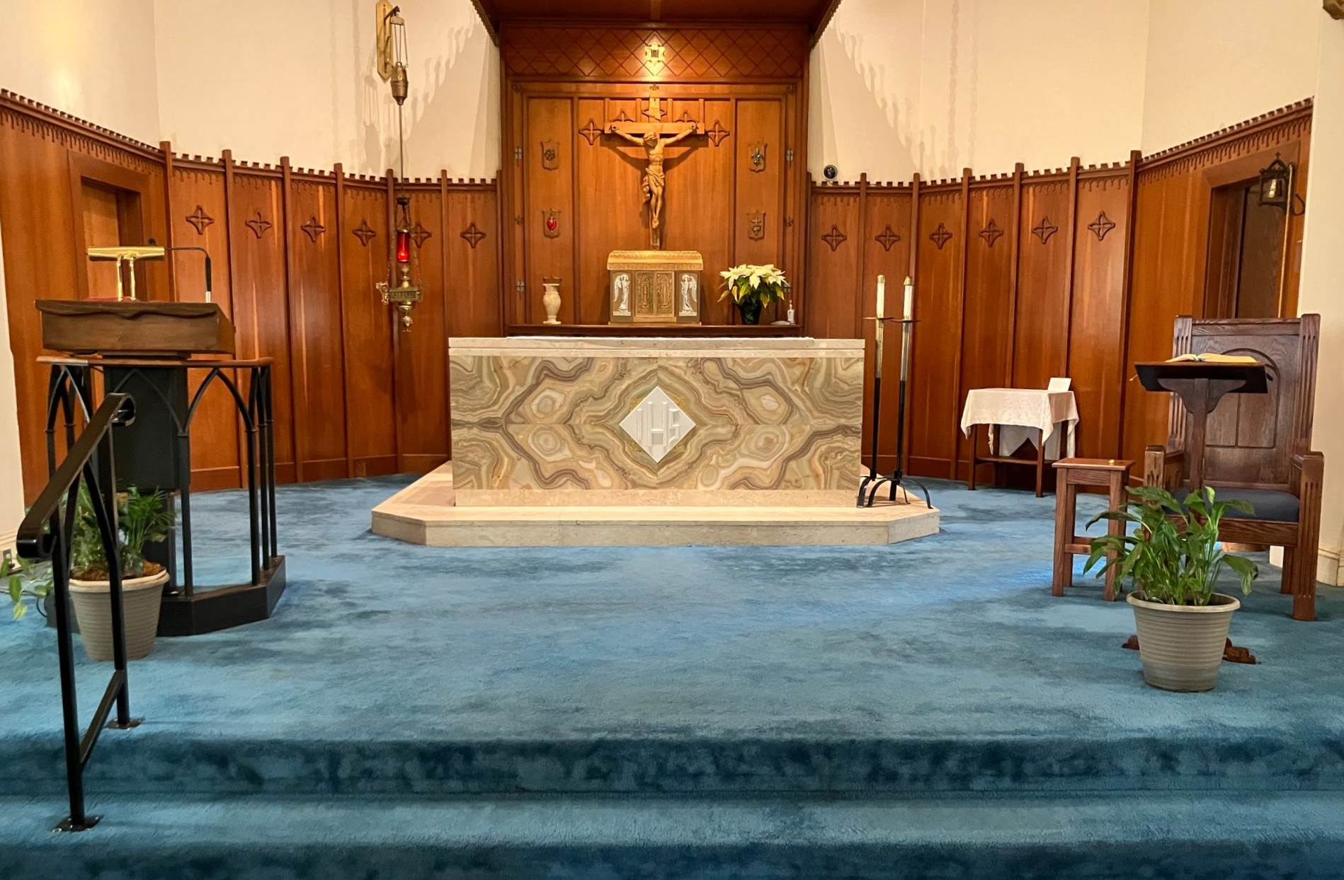 Park across the street at the parish center. Overflow parking behind the church.